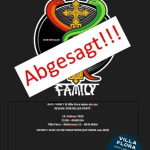 BASS FAMILY REGGAE-DUB-KELLER-PARTY 07. Februar 2026 21.00 UHR – 04.00 UHR Liebe Musikliebhaber der Villa Flora Wir, die “BASS FAMILY”, sind eine Familie aus der Nachbargemeinde Fischenthal (Steg) und heissen Nadine und Markus. Unsere DJ-Namen sind “DJane Nandini” und “Dub Senator”. Wir befassen uns bereits seit drei Jahrzehnten mit der Reggaemusik und leben den spirituellen […]